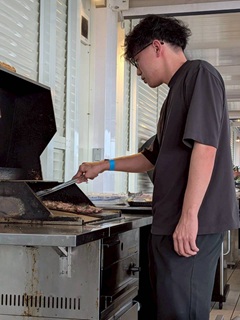 真剣なまなざしでお肉を焼かれていますね、、!